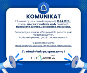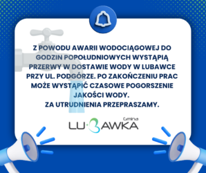 Z powodu awarii wodociągowej do godzin popołudniowych wystąpią przerwy w dostawie wody w Lubawce przy ul. Podgórze. Po zakończeniu prac może wystąpić czasowe pogorszenie jakości wody. Za utrudnienia przepraszamy.