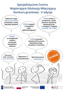 Ośrodek Rozwoju Edukacji w Warszawie w ramach realizacji projektu „Budowa skoordynowanego systemu pomocy specjalistycznej opartego na Specjalistycznych Centrach Wspierających Edukację Włączającą” (SCWEW) organizuje cykl działań upowszechniających V edycję konkursu grantowego. Nabór wniosków planowany jest od 27 kwietnia br.