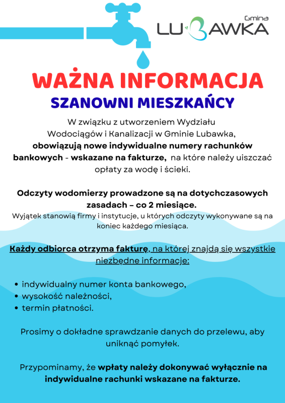 W związku z utworzeniem Wydziału Wodociągów i Kanalizacji w Gminie Lubawka, obowiązują nowe indywidualne numery rachunków bankowych - wskazane na fakturze, na które należy uiszczać opłaty za wodę i ścieki.