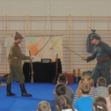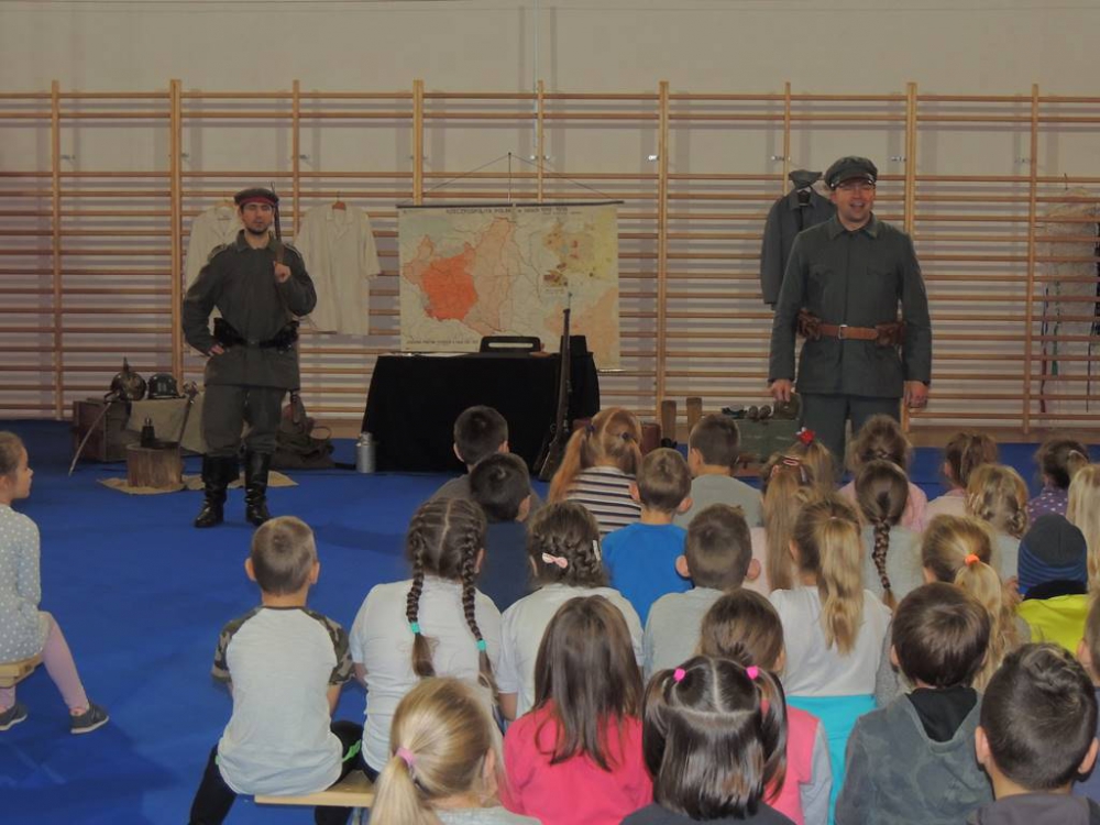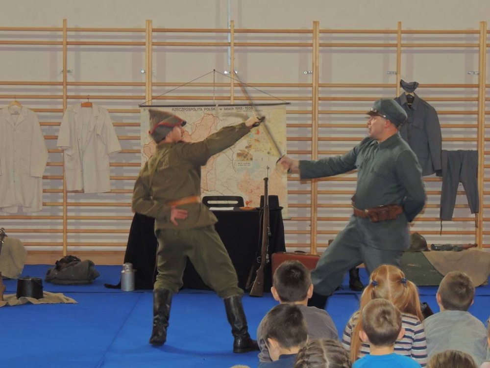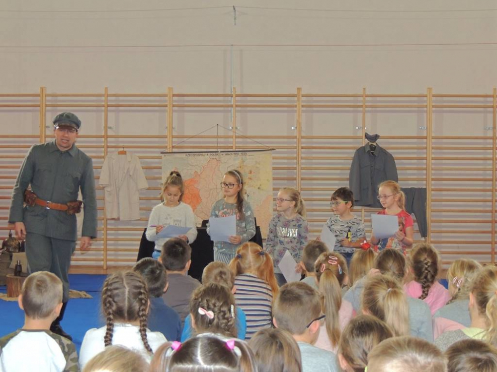 Na niezwykłą żywą lekcję historii w wykonaniu Agencji Widowisk Historycznych Arkona zostali zabrani dziś (14.11.019 r) uczniowie klas I - VIII naszej szkoły. Temat audycji brzmiał: ,,123 lata zaborów - marsz ku niepodległości". Uczniowie mieli okazję zobaczyć umundurowanie żołnierzy polskich, niemieckich i bolszewickich z okresu walki o niepodległość, wcielić się w rolę poborowego Legionistów Piłsudzkiego, wziąć udział w plebiscycie niepodległościowym i zobaczyć walkę na szable. Wszystko to zostało okraszone dużą dawką dowcipu i sprawiło, że każdy uczeń ze spektaklu wychodził nie tylko z dużą dawką wiedzy, ale i z uśmiechem na twarzy.