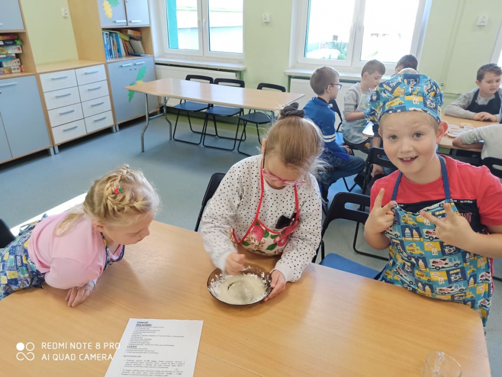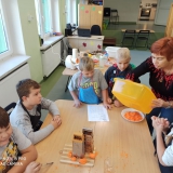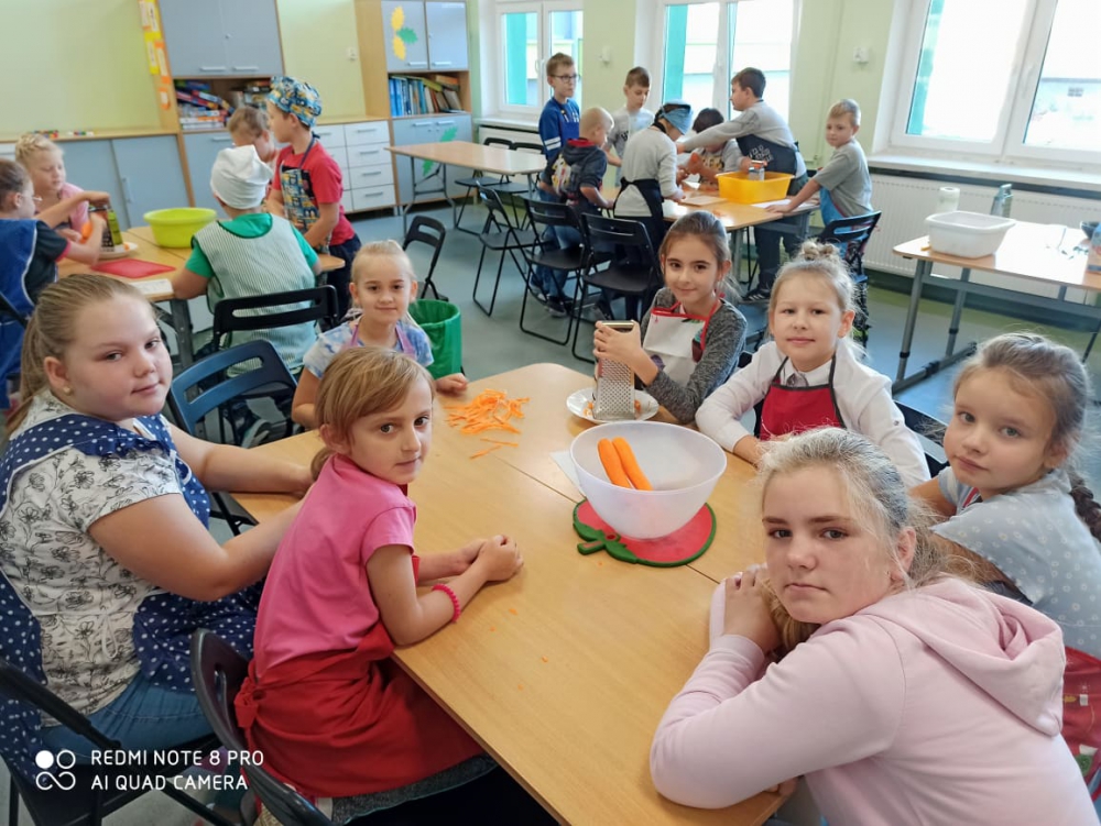 Wspólna praca w kuchni to świetna zabawa, a samodzielnie wykonane wypieki smakują jak żadne inne. Dziś przekonali się o tym uczniowie klasy III b piekąc marchewkowe babeczki. Zajęcia rozpoczęły się od zapoznania z przepisem. W grupach z pomocą pani Elżbiety Sarzyńskiej i wychowawczyni Magdaleny Legutko-Bizoń dzieci obierały i tarły marchewkę, odmierzały i mieszały składniki, nakładały ciasto do papierowych foremek. Podczas wspólnej kulinarnej przygody uczniowie odkryli, że skorupka jajka jest bardzo, ale to bardzo krucha, a olej baaardzo śliski. Nadszedł czas na słodki poczęstunek, na który wszyscy czekali z niecierpliwością. Dzieci były z siebie dumne. Babeczki znikały w oka mgnieniu, pozostały tylko ????okruszki. Zapach rozszedł się po całej szkole, więc niektórzy mogli osobiście sprawdzić czy smakują równie dobrze jak pachną. Warto nauczyć dzieci, że słodycze to nie codzienny posiłek. Do naszych zdrowych przekąsek warto wykorzystać owoce i warzywa. Co ważne - należy pamiętać, że takich słodyczy nie można jeść bez ograniczeń. To zdrowe przekąski, zdrowe słodycze, ale to nadal słodycze. Pyszna zabawa, walory edukacyjne i kulinarne to doskonały pomysł na twórcze spędzenie czasu z dzieckiem do czego zachęcamy wszystkich rodziców.
