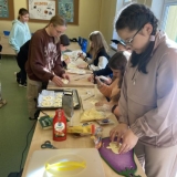 Dnia 30 października klasa 6b zorganizowała skromną ucztę z okazji Halloween na zajęciach języka angielskiego. Uczniowie wraz z panią Anną Majerską mieli okazję spróbować swoich umiejętności kulinarnych robiąc pyszne ciastka - dynie z ciasta francuskiego. Zajęcia zakończyły się wspólnym zdjęciem oraz quizem wiedzy o Halloween. Podczas zajęć tematycznych uczniowie rozwijali nie tylko swoją wrażliwość międzykulturową ale także w przyjemny sposób zdobywali wiedzę na temat jak ludzie celebrują swoje tradycje w innych krajach.
