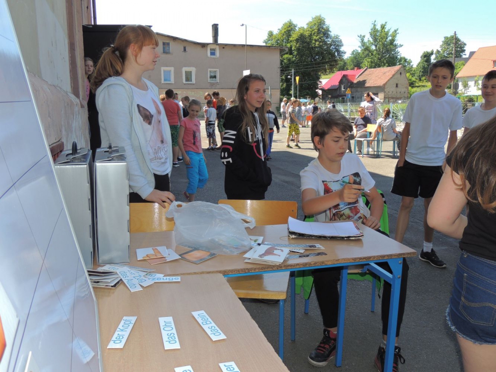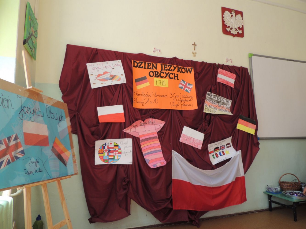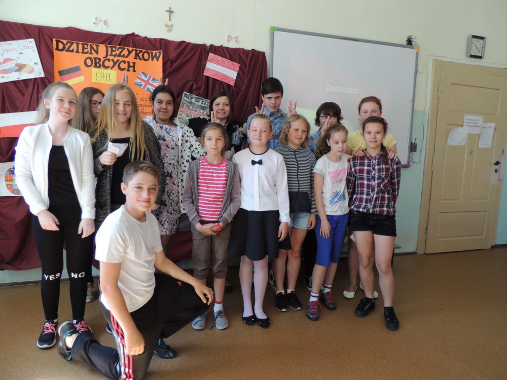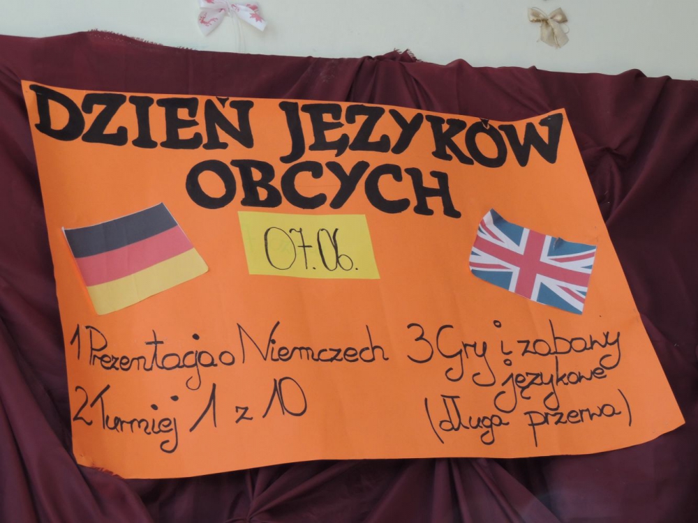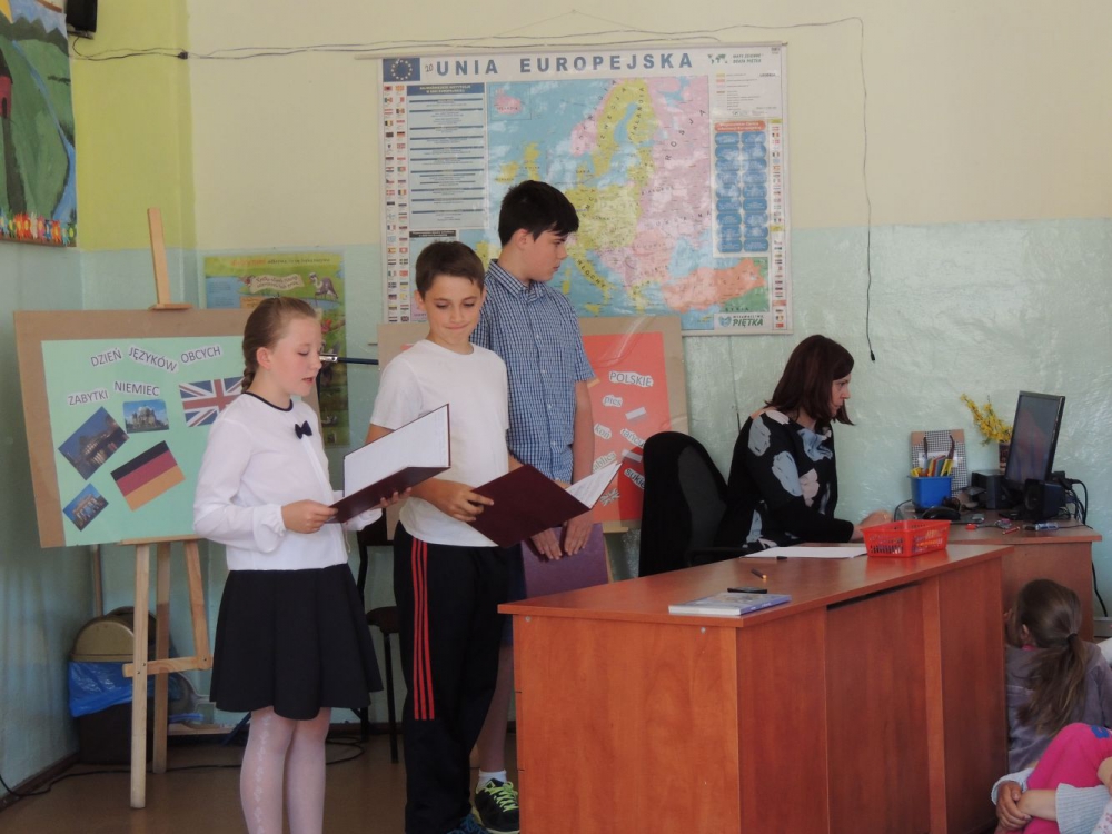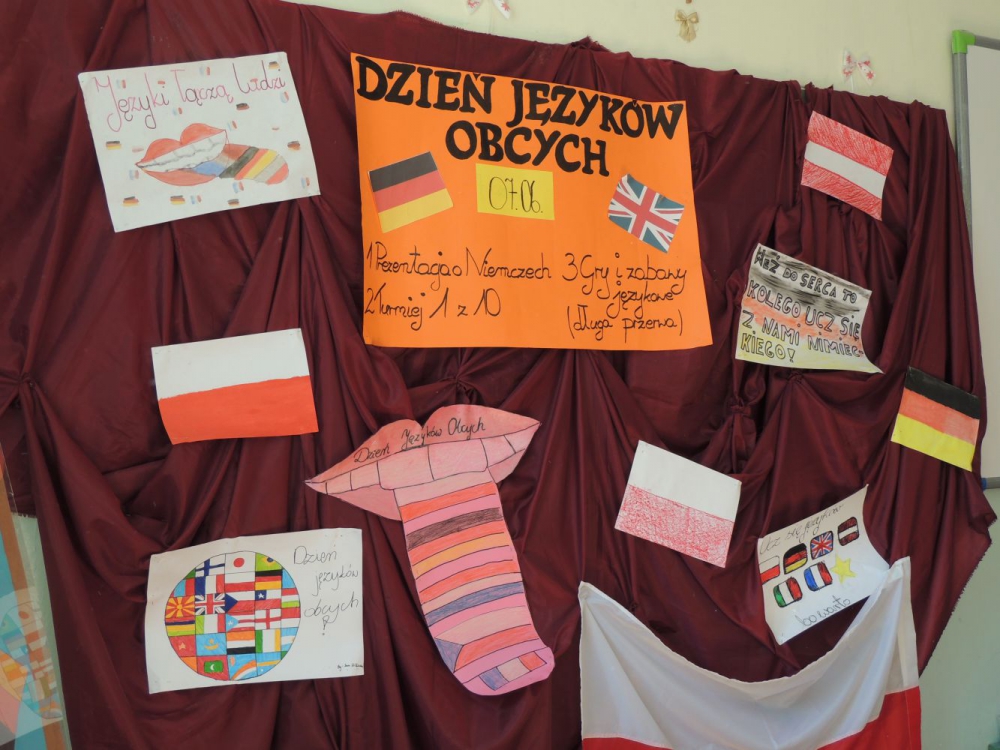 Dnia 7.06.2016r. w naszej szkole świętowaliśmy Dzień Języków Obcych przygotowany przez uczniów naszej szkoły z kl.5(a,b) i 6(a,c) z pomocą Magdaleny Radomskiej. Program zawierał część oficjalną - prezentacje uczniów klasy 6a o Niemczech: tradycjach, obyczajach, głównych wydarzeniach historycznych i ogólnych informacjach. Prezentowane również były filmiki i prezentacje (przygotowane przez dzieci z klasy 6a i 6c) dotyczące różnic językowych oraz ochrony środowiska. Następnie przeprowadzony został quiz wiedzy z języka niemieckiego 1 z 10. W części nieoficjalnej - na długiej przerwie odbywały się różne gry, konkursy i zabawy z językiem angielskim i niemieckim zorganizowane przez uczniów klas 5 i 6. Dzieci chętnie brały udział w poszczególnych konkurencjach. Na boisku było gwarno i kolorowo. Pogoda i humory dopisały.