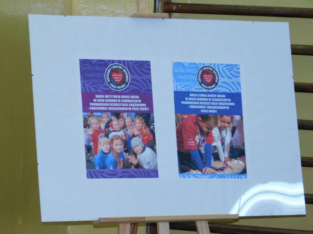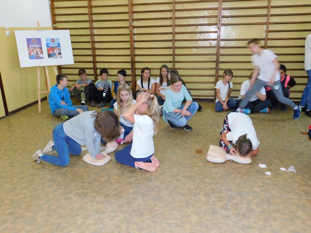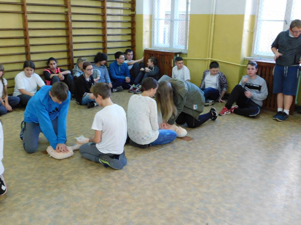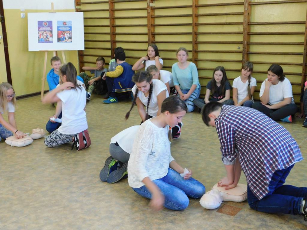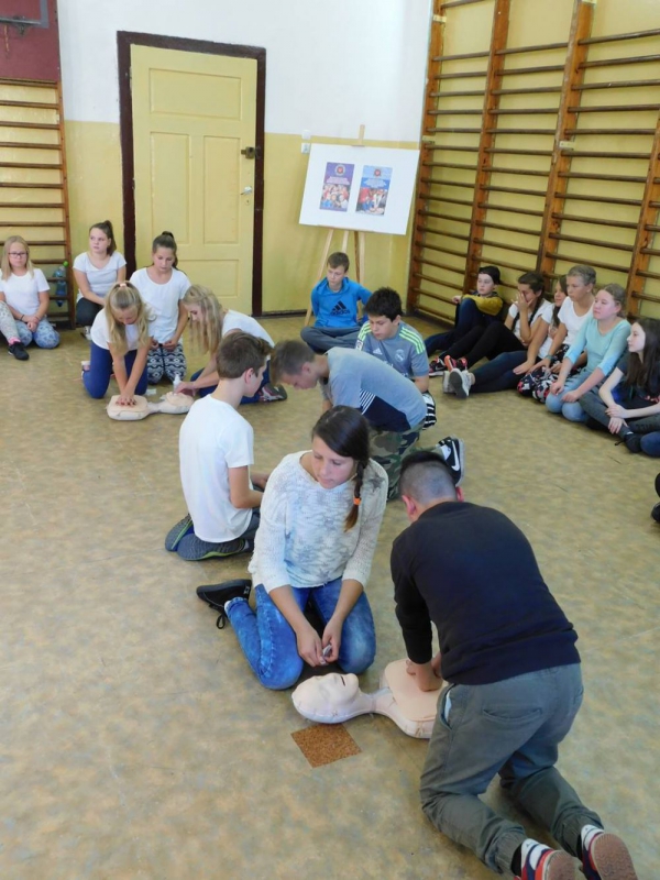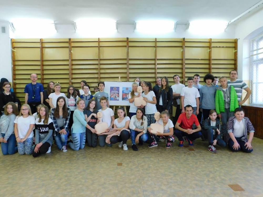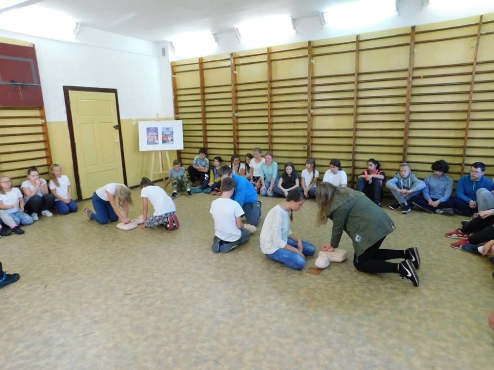 Prawie czterdziestu uczniów z klasy 7 b i 7 c naszej szkoły stanęło dziś (16.10.2017r) do bicia rekordu w resuscytacji krążeniowo - oddechowej. Wszystko zaczęło się tak jak w całej Polsce o godzinie 12 i trwało 30 minut. Całość była utrwalana na filmie DVD i zostanie przesłana do organizatora całej akcji czyli Fundacji Wielkiej Orkiestry Świątecznej Pomocy. W tym roku uczniowie wykonywali resuscytację na trzech fantomach jednocześnie. Koordynatorem akcji na terenie szkoły był pan Krzysztof Jawor, który dziękuje za bezcenną pomoc nauczycielom wychowania fizycznego panom: Arturowi Bodzkowi, Łukaszowi Winczy oraz wspaniałym uczniom, bez których pomocy ta akcja by się nie odbyła. Wyniki akcji poznamy za kilka dni.