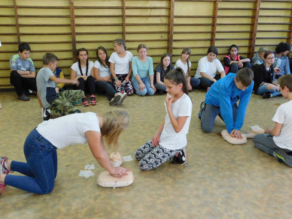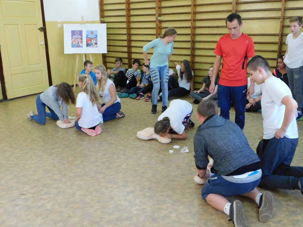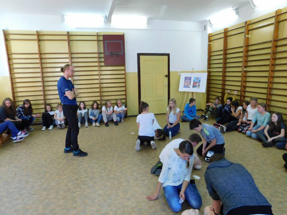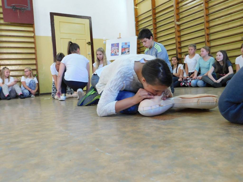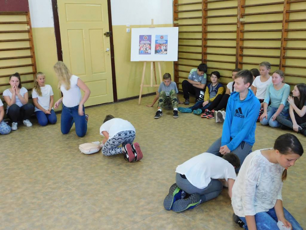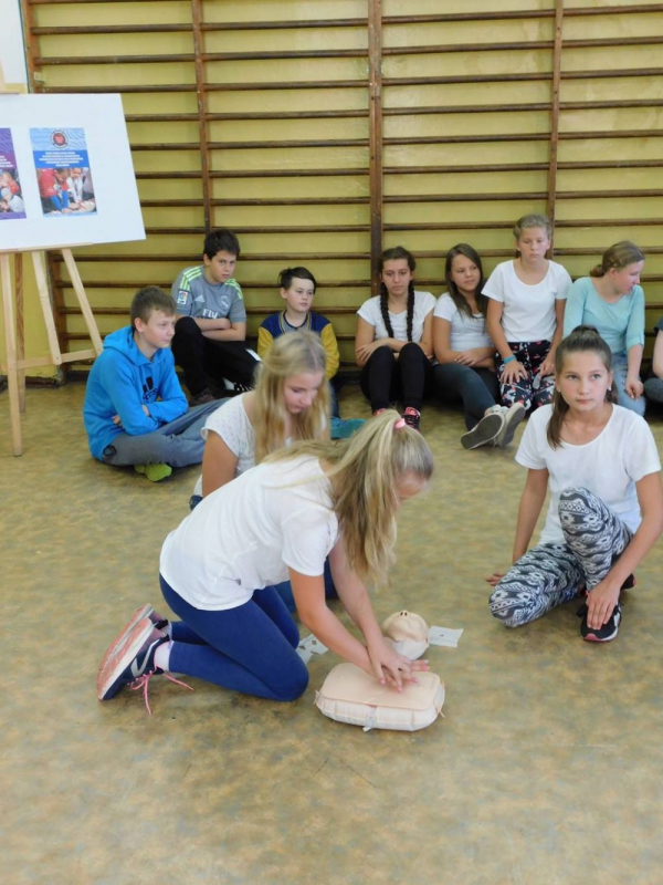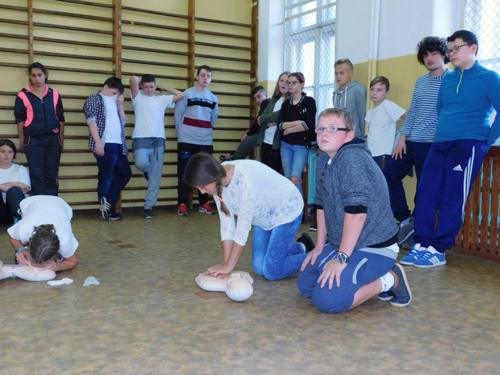 Prawie czterdziestu uczniów z klasy 7 b i 7 c naszej szkoły stanęło dziś (16.10.2017r) do bicia rekordu w resuscytacji krążeniowo - oddechowej. Wszystko zaczęło się tak jak w całej Polsce o godzinie 12 i trwało 30 minut. Całość była utrwalana na filmie DVD i zostanie przesłana do organizatora całej akcji czyli Fundacji Wielkiej Orkiestry Świątecznej Pomocy. W tym roku uczniowie wykonywali resuscytację na trzech fantomach jednocześnie. Koordynatorem akcji na terenie szkoły był pan Krzysztof Jawor, który dziękuje za bezcenną pomoc nauczycielom wychowania fizycznego panom: Arturowi Bodzkowi, Łukaszowi Winczy oraz wspaniałym uczniom, bez których pomocy ta akcja by się nie odbyła. Wyniki akcji poznamy za kilka dni.